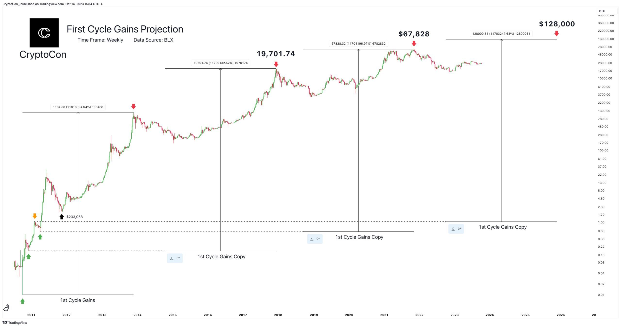 Чуть более скромный прогноз курса биткоина дал технический аналитик CryptoCon. Он считает, что целью для обновления ATH криптовалюты может стать уровень $128 000. Событие, по его подсчетам, произойдет ближе к концу 2025 года.