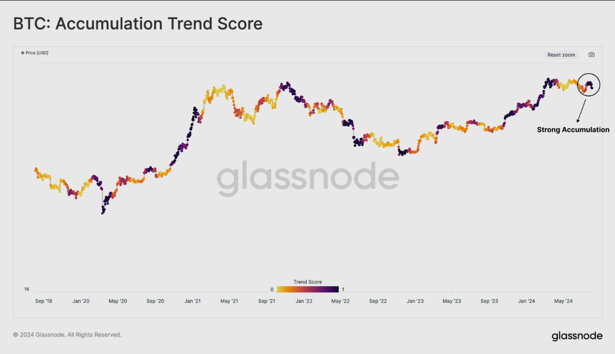 С тех пор, как в марте BTC обновил исторический максимум, рынок переживал длительный период распределения предложения. Однако теперь эта тенденция меняется, о чем свидетельствует показатель Accumulation Trend Score (ATS). Метрика измеряет, насколько активно люди покупают или продают криптовалюту.