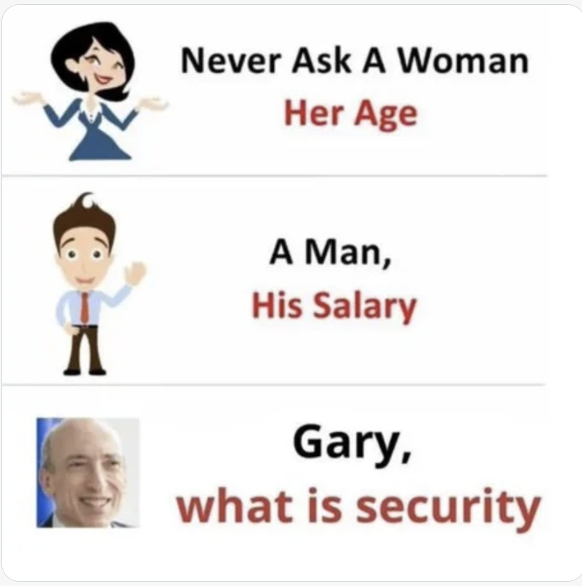 Не обошлось без шуток и в адрес Гэри Генслера, главы Комиссии по ценным бумагам и биржам (SEC) в США. Он так и не смог толком объяснить, что такое ценная бумага, и по какому принципу он навешивает на криптовалютные активы этот статус.