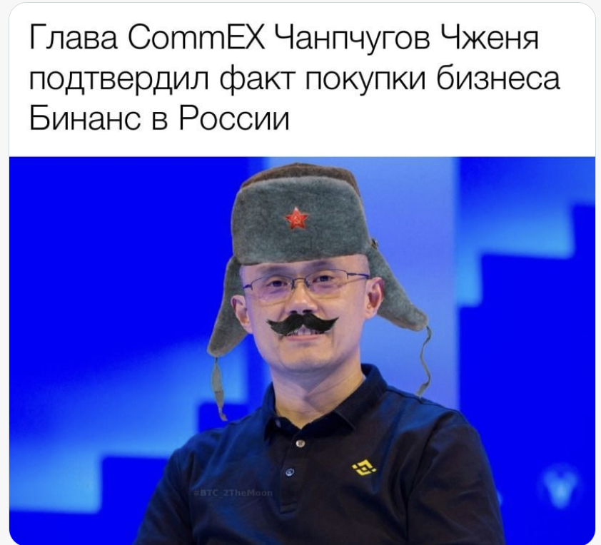 Новость о том, что криптобиржа Binance ушла из России, продав весь свой местный бизнес никому не известной компании CommEX, тоже породила целую серию мемов. В частности, участники криптосообщества заподозрили, что CommEX — это лишь подставное лицо, а Binance надеется таким образом продолжить работу в России не привлекая внимание санитаров регуляторов.