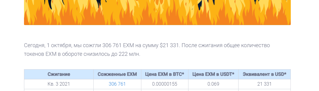 На официальном сайте EXMO утверждается, что по итогам последнего ежеквартального сжигания токенов, в обороте находится 222 млн EXM.