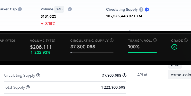 Однако криптовалютные агрегаторы показывают совершенно иную картину. CoinMarketCap показывает, что на момент написания материала в обороте находятся 103,3 млн EXM. По данным CoinGecko и Nomics, токенов еще меньше — 37,8 млн EXMO.