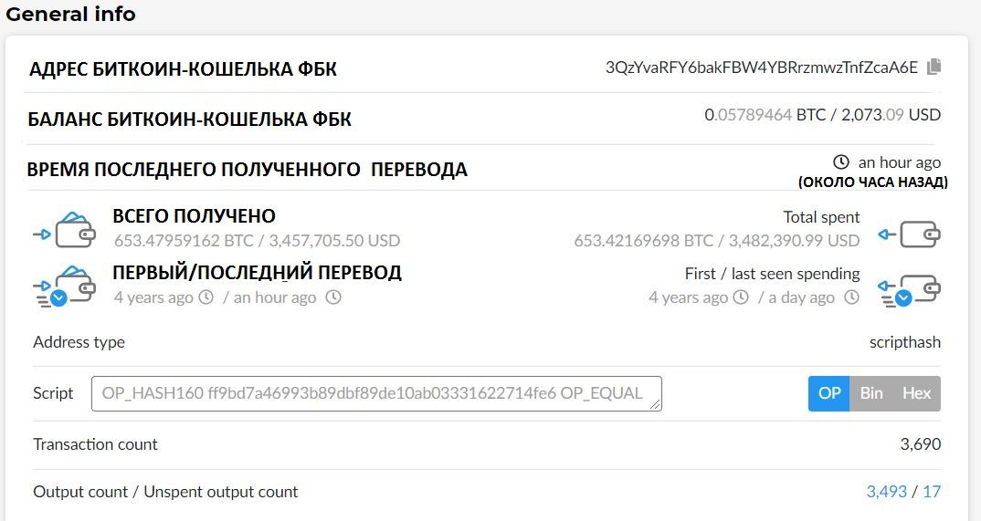 Всего, с момента начала приема донатов в криптовалюте, на биткоин-кошелек ФБК прислали 653.47959162 BTC (свыше $22 млн, по текущему курсу). По данным Blockchair, пожертвования в монете продолжают поступать.