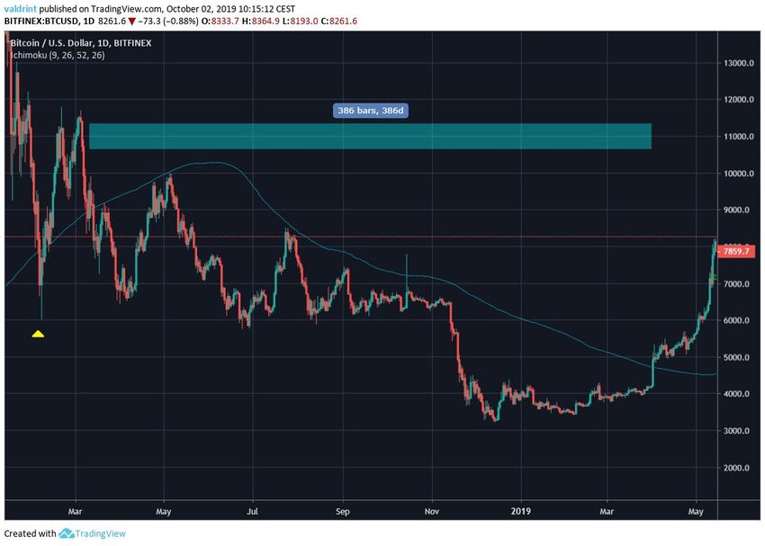 Ранее BTC торговался ниже 200-дневной скользящей средней в течение почти 390 дней, с марта 2018 года по апрель 2019 года.
