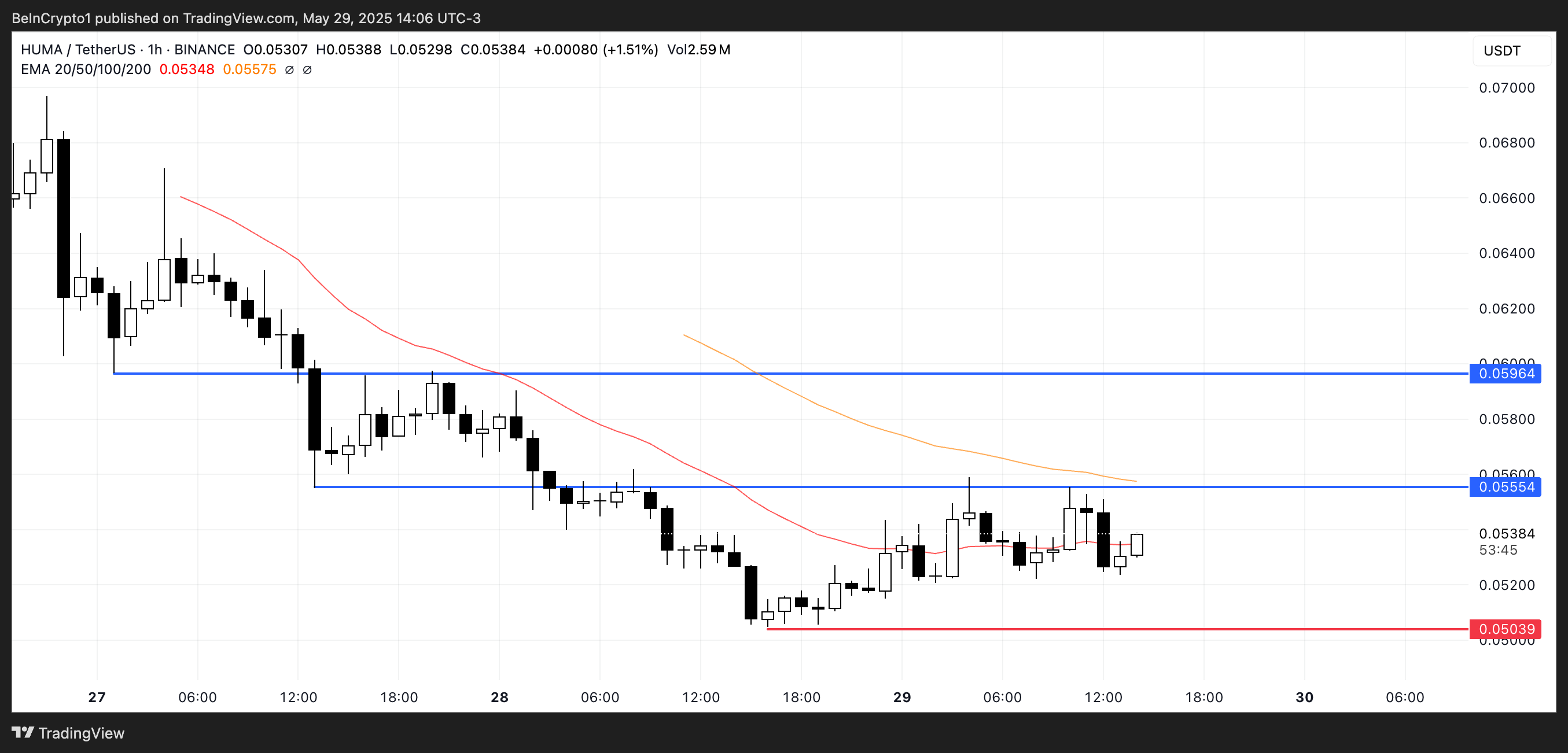 Тем не менее, если настроение изменится и токен найдет поддержку, он может восстановиться и попытаться преодолеть сопротивление на уровне $0,055. Более сильное ралли может подтолкнуть HUMA к $0,0596, но для этого потребуется устойчивая положительная динамика.