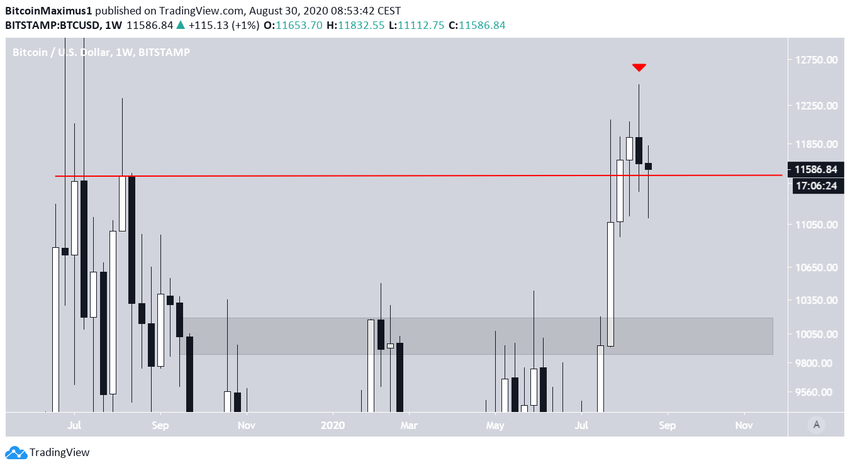 С другой стороны, бычье закрытие подаст сигнал бычьего разворота дневного. Дневное закрытие над уровнем $11 640 обусловит паттерн продолжения на недельном графике, а над предыдущем сопротивлением появится свеча Доджи.