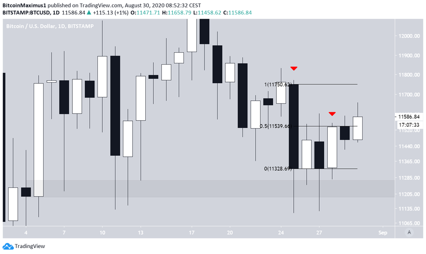 25 августа биткоин сформировал свечную модель медвежьего поглощения, которая отправила котировки к минимуму $11 112. Однако при этом BTC сформировал длинный нижний фитиль и отскочил от зоны поддержки $11 200. С тех пор цена движется в северном направлении.