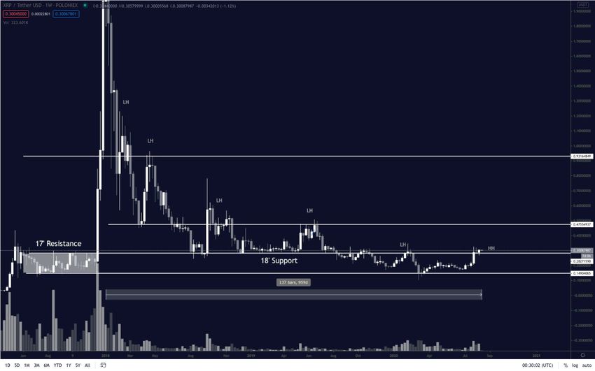 На прошлой неделе криптовалюта закрылась на отметке $0.307. Это самый высокий уровень недельного закрытия за год. Более того, цена обосновалась над важным уровнем $0.29, который выступал в роли поддержки с октября 2018 года по август 2019 года. Затем эта зона превратилась в сопротивление, от которого котировки отскакивали трижды.