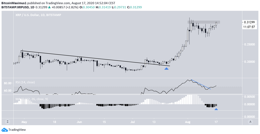 XRP растет ускоренными темпами с 19 июля, когда цена пробила линию нисходящего сопротивления. Затем котировки натолкнулись на сопротивление в районе $0.315 и отскочили. На момент написания вторая по величине криптовалюта снова тестировала эту важную зону.