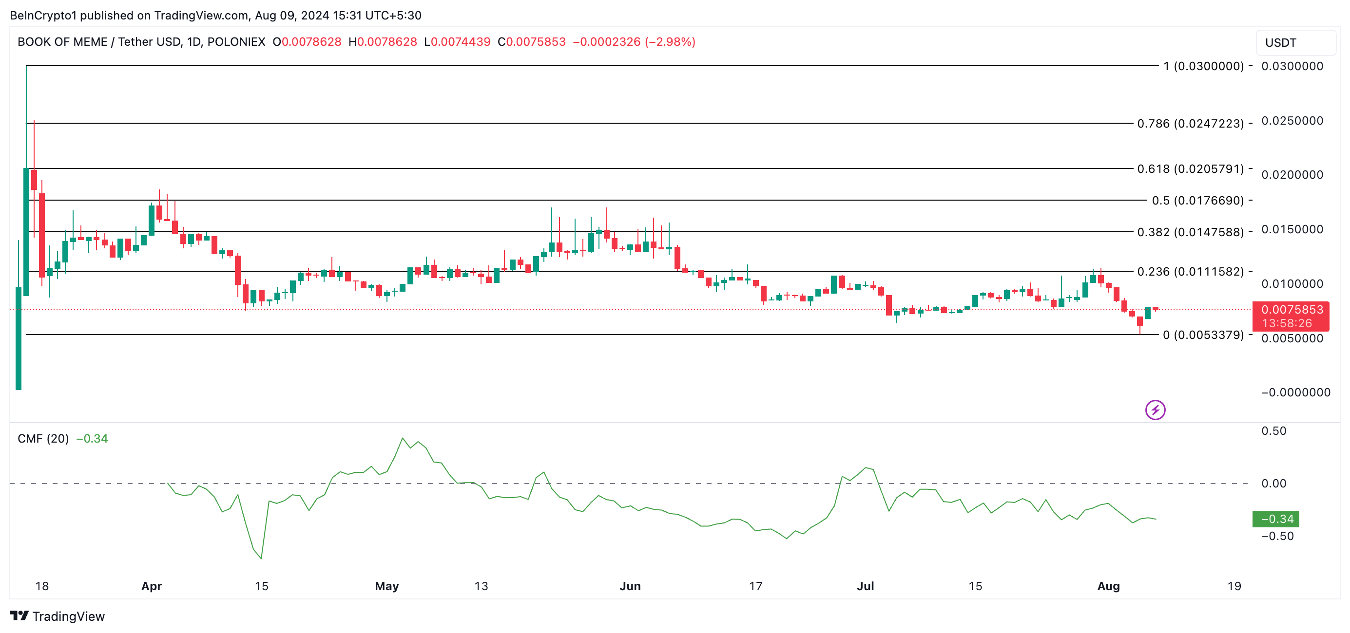 Хотя в среду BOME достиг пика в $0,0074, индекс денежного потока Чайкина (CMF) остался отрицательным, что указывает на медвежью дивергенцию. На момент публикации CMF составляет -0,34.