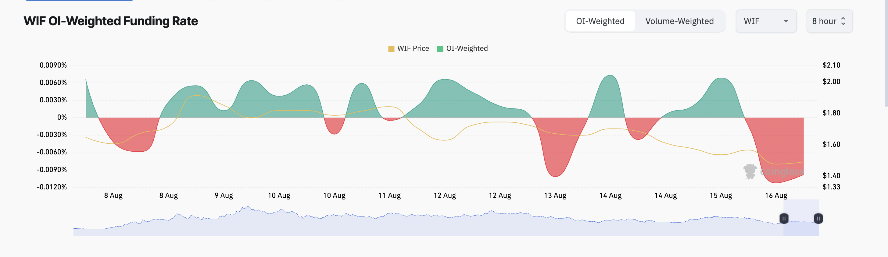 Снижение WIF спровоцировало рост числа коротких позиций на фьючерсном рынке. Данные Coinglass показывают, что ставки финансирования WIF оставались в основном отрицательными на протяжении всей недели.