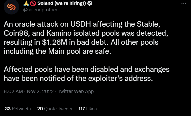 Алгоритмический протокол криптовалютного кредитования Solend стал жертвой атаки на котировочный оракул. Об этом разработчики проекта сообщили в твиттере. По итогам инцидента, Solend лишился более $1,2 млн в криптовалюте.