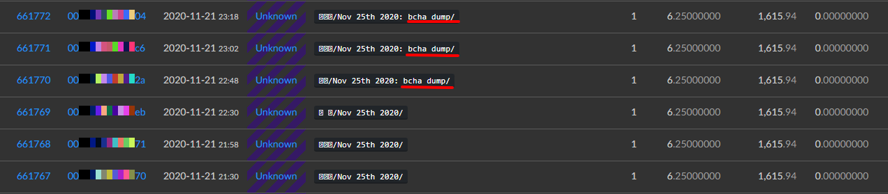 Согласно данным блокчейна, впервые неизвестный майнер начал подавать сигналы о дампе токена BCHA еще 21 ноября в 22:48 по МСК. До этого он останавливал сеть на протяжении 50+ блоков добывая только пустые блоки с подписью «/Nov 25h 2020/».