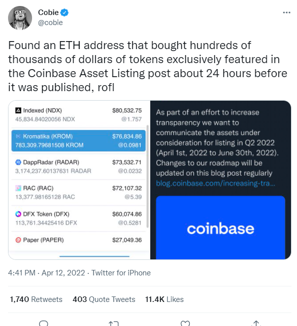 Неизвестный аккаунт закупился альткоинами на $400 000 ровно за сутки до того, как биржа Coinbase объявила о рассмотрении их листинга. Первым на это обратил внимание криптоинфлюенсер под псевдонимом Cobie.