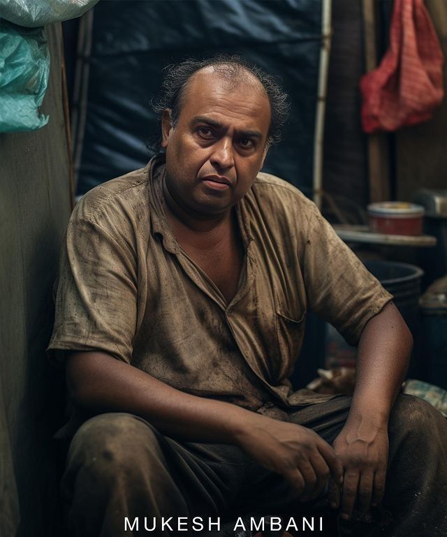 Переходим к номеру девять в рейтинге богатейших людей, по версии Forbes — индийскому бизнесмену Мукешу Амбани. Нейросеть помогла ему «примерить» образ «миллионера из трущоб»: