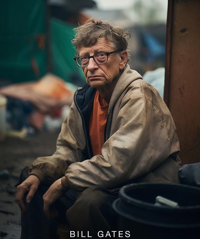 На очереди шестая строчка рейтинга богатейших людей, по версии Forbes и ее обладатель — основатель Microsoft Билл Гейтс. Вот как он мог бы выглядеть, по версии нейросети, будучи бедняком без цента в кармане: