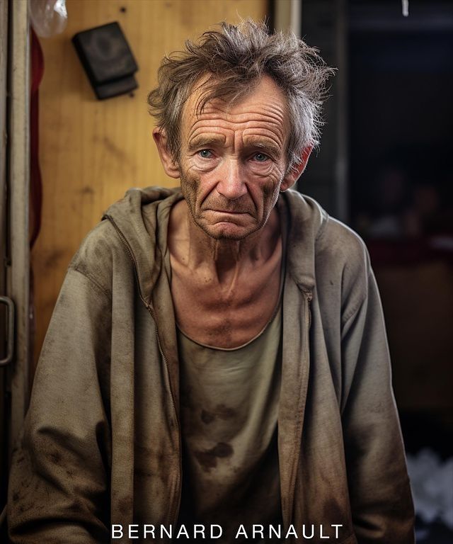 Завершает наш «топ» французский бизнесмен Бернар Арно, который вместе с семьей занимает первую строчку рейтинга богатейших людей мира, по версии Forbes. Напомним, под его контролем находится Louis Vuitton Moët Hennessy. Вот каким нейросеть видит Бернара Арно из параллельной вселенной — той, где богачи с бедняками поменялись жизнью: