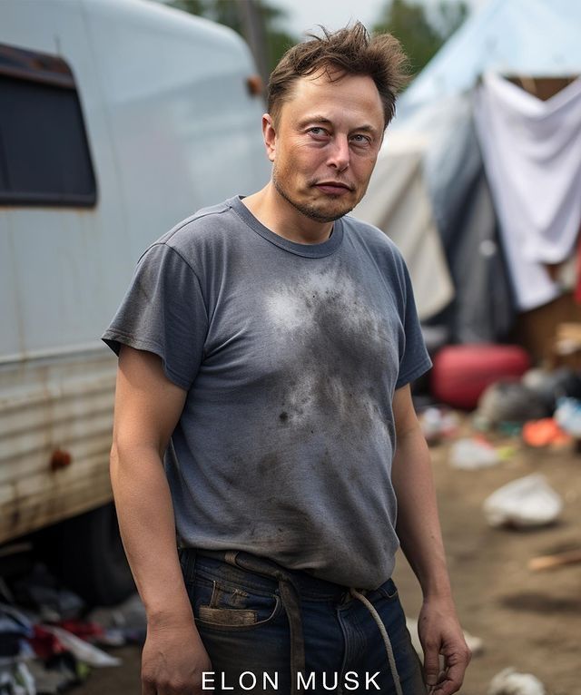 Начнем с американского бизнесмена, владельца компании-производителя электрокаров Tesla и, по совместительству, любителя криптовалюты Dogecoin — Илона Маска. Forbes оценивает его состояние в $180 млрд. В рейтинге самых богатых людей планеты, подготовленном изданием, Маск занимает второе место. Положение бизнесмена не помешало нейросети представить, как бы миллиардер выглядел в случае утраты своего капитала — если бы ему пришлось переехать жить в старенький трейлер:
