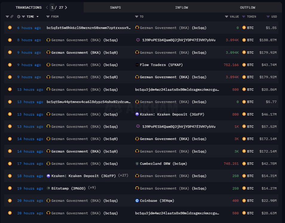 Данные Arkham Intelligence показывают, что вчера немецкое правительство отправило 2 700 BTC на крупные биржи, такие как Kraken, Bitstamp и Coinbase. После этого они получили обратно 4 169 BTC, а затем перевели 748,25 BTC на Cumberland и еще 2 300 BTC на Kraken и другие платформы.