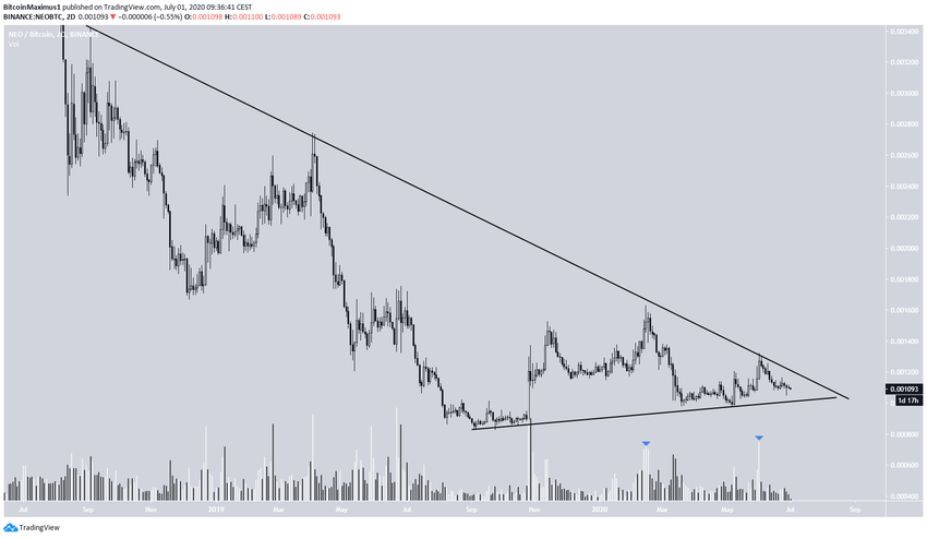 В паре с биткоином курс NEO с сентября 2018 года движется вдоль линии нисходящего сопротивления. Последний раз цена коснулась этой линии 2 июня и с тех пор снижается. Пробой этого сопротивления может стать сигналом о начале значительного долгосрочного восходящего тренда.