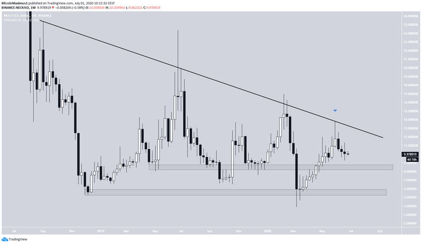 Курсы NEO/BTC и NEO/USD достигли в начале июня линий долгосрочного нисходящего сопротивления, но с тех пор снижаются. Дальнейшее направление движения криптовалюты остается неясным.