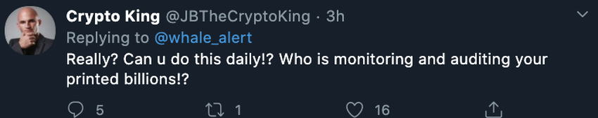 Неудивительно, что сообщения о новых эмиссиях стали вызывать все более негативный отклик со стороны криптосообщества. Его участники начинают обвинять руководство Tether в сомнительных махинациях.
