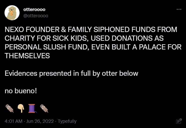 Анонимные пользователи Твиттера обрушились с критикой в адрес соучредителей Nexo, обвиняя их в хищении денег, предназначенных для благотворительности