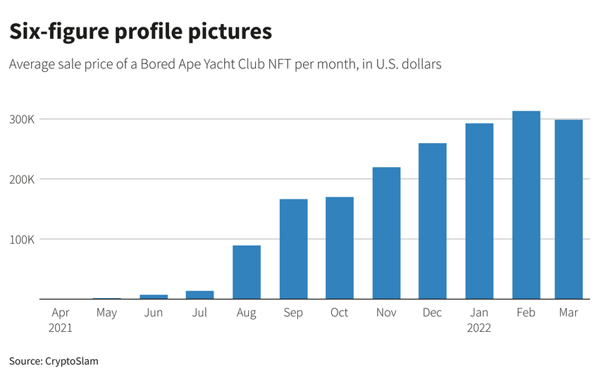 Средняя стоимость NFT-токенов из коллекции Art Blocks снизилась с $15 000 в прошлом сентябре до $4 200 в марте. Однако цены на NFT из популярной серии Bored Ape Yacht Club продолжают держаться в районе $300 000.