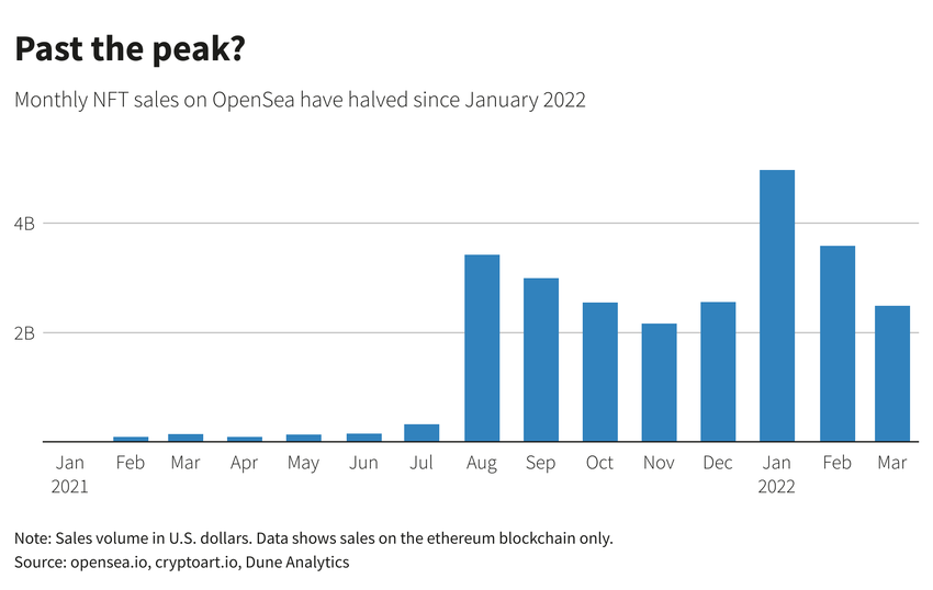 В итоге к январю 2022 года показатель продаж на OpenSea достиг $5 млрд. Впрочем, в прошлом месяце торговые объемы просели от этого уровня вдвое, до $2,5 млрд.