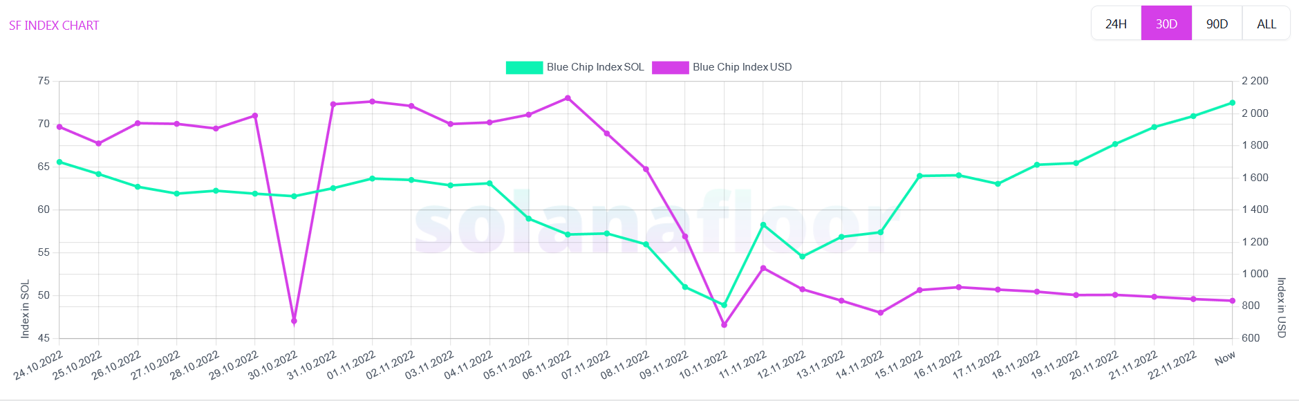 Еще одним лучиком надежды является высокая жизнестойкость Solana на фоне коллапса FTX. «Голубые фишки» NFT от этого блокчейна в течение последних 30-ти дней демонстрировали довольно неожиданный устойчивый рост минимальных цен на токены. На момент написания статьи внутридневной прирост индекса SF NFT Index тоже составлял около 4%.