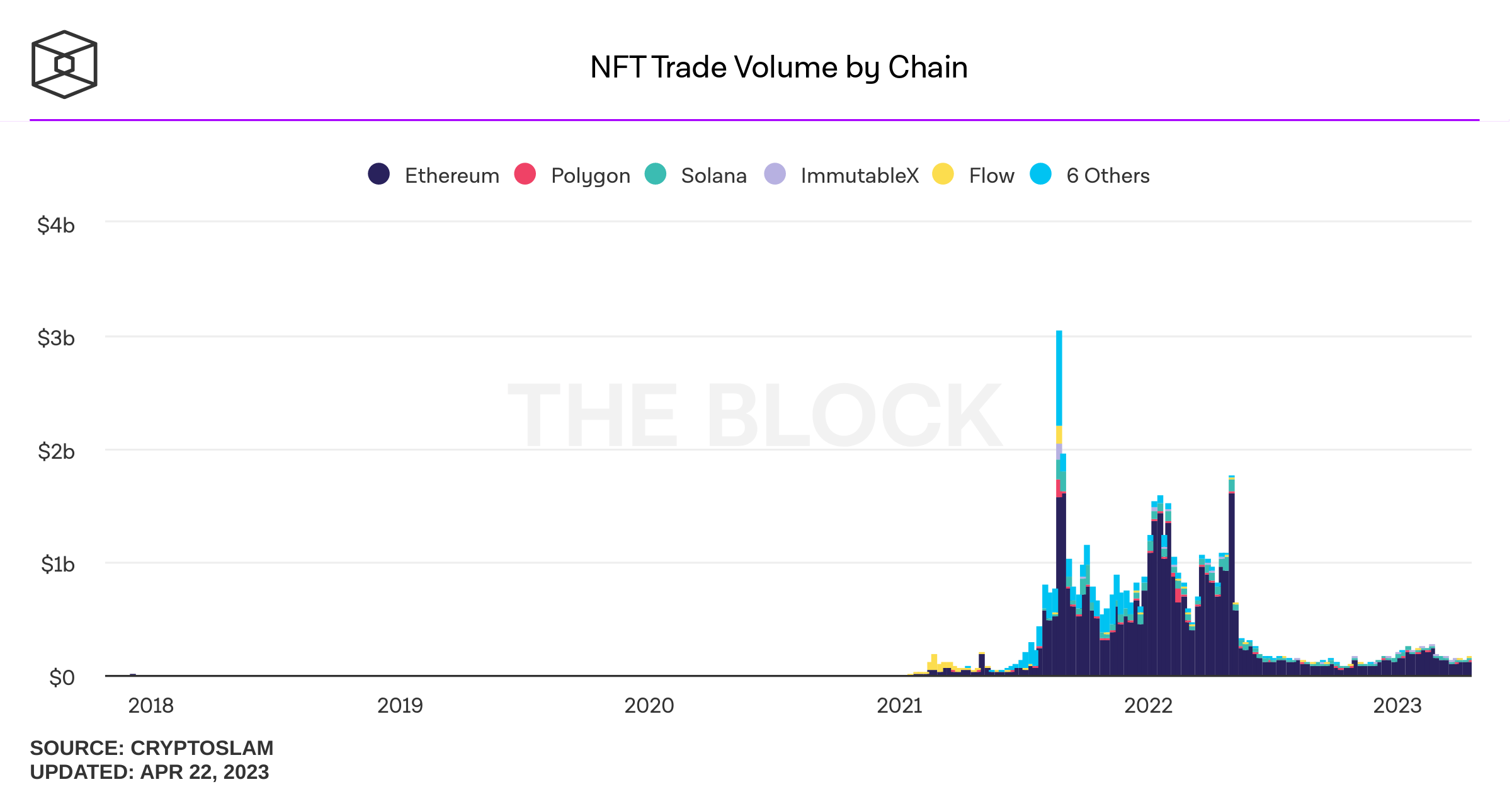 Впрочем, Starbucks — не единственные, кому не повезло с продажами. Согласно данным The Block, за последние несколько недель активность пользователей на NFT-маркетплейсах заметно снизилась, а объем торгов невзаимозаменямыми токенами на всех блокчейнах сильно просел.