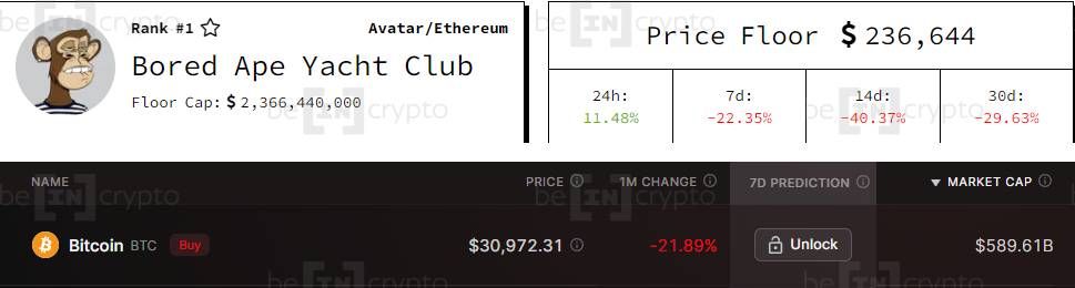По данным NFT Price Floor, рыночный ценник BAYC за последние 30 суток обвалился на ~29,6%. При этом биткоин за этот же промежуток времени упал на ~21,9%, по данным Nomics.