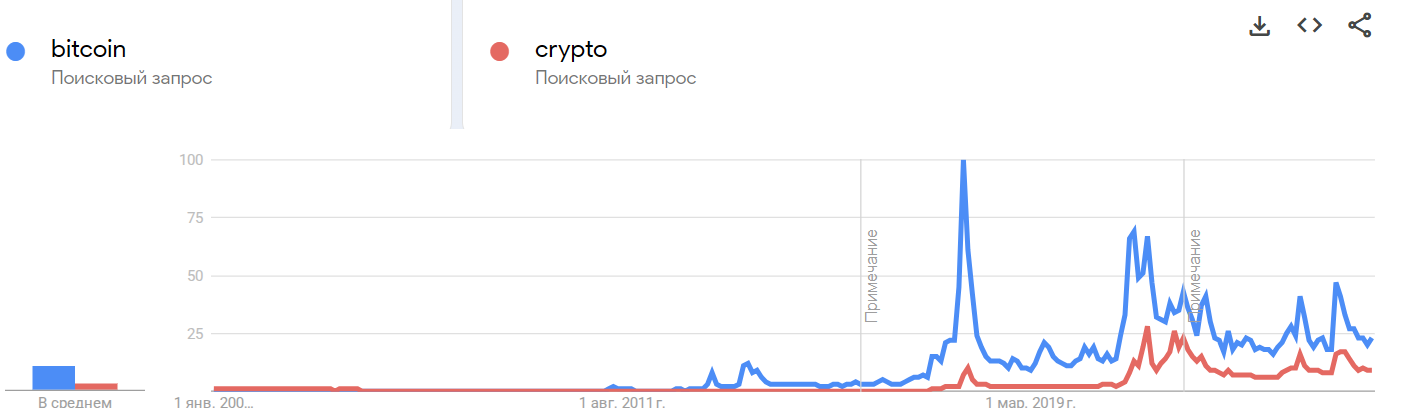Пока биткоин бьет рекорды, количество поисковых запросов по монете и крипте в целом, по данным Google trends, остается на уровне ноября 2020 года. Низкий интерес к теме может говорить о том, что в рынок еще не вошли частные инвесторы.