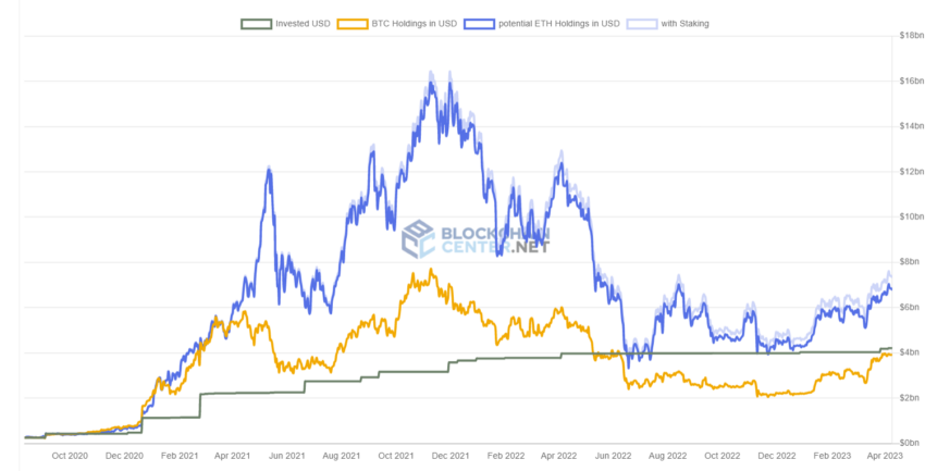 Платформа Blockchain Center смоделировала эту ситуацию. Согласно ее данным, если бы MicroStrategy покупала ETH, к настоящему времени у компании было бы 3,68 млн монет стоимостью $6,883 млрд. Для сравнения, стоимость принадлежащих компании биткоинов составляет $3,926 млрд.