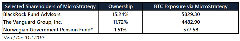 Вместе с Норвежским государственным пенсионным фондом косвенными владельцами ВТС оказались BlackRock (5829,3 BTC ~ 63,8 млн долларов США) и The Vanguard Group (4482,9 BTC ~ 49,1 млн долларов США).