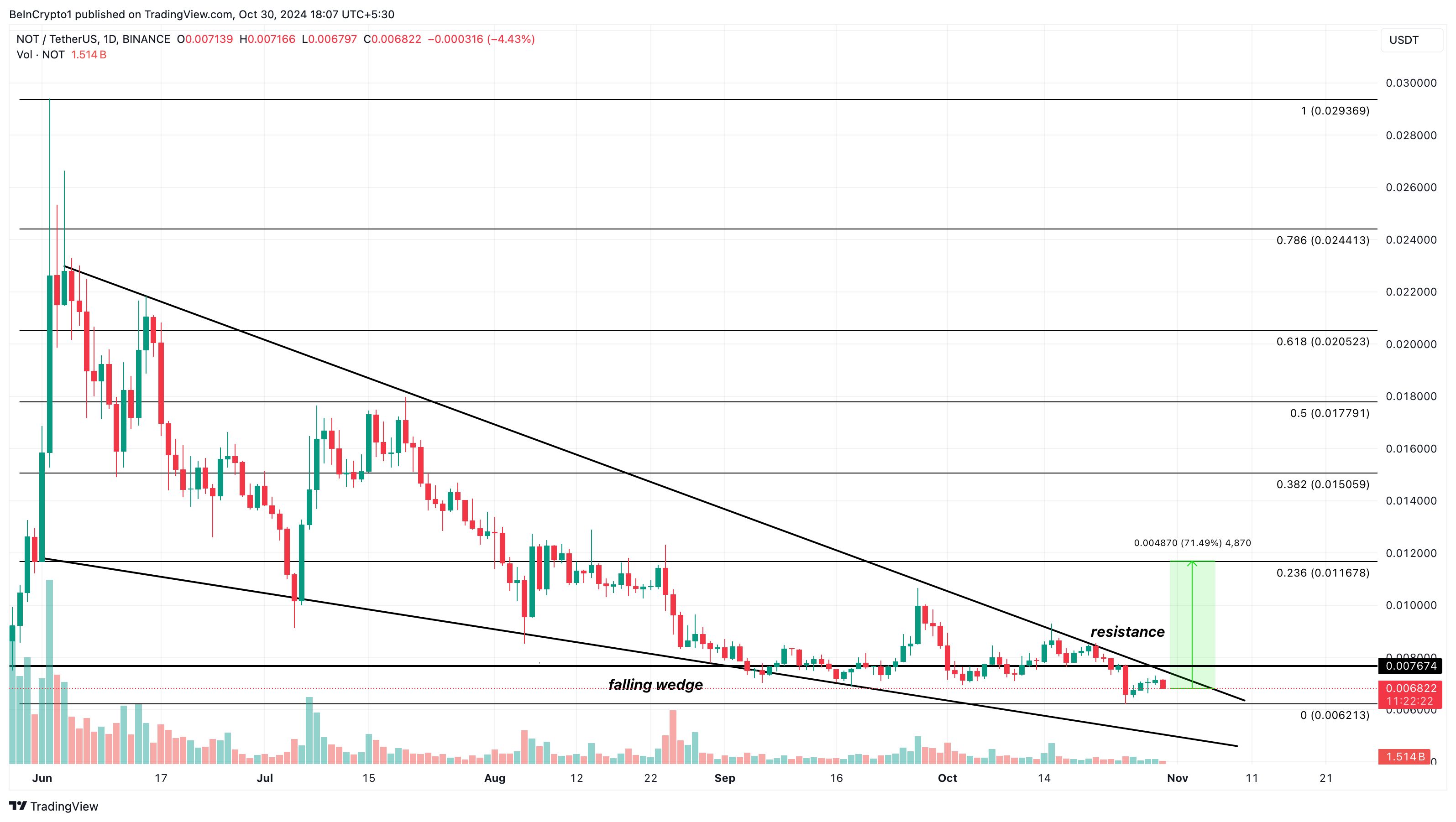 На дневном графике Notcoin сформировал падающий клин, который в техническом анализе считается признаком возможного бычьего разворота. Этот технический паттерн появляется, когда цена снижается в пределах сходящихся трендовых линий. Он предвещает потенциальный прорыв вверх после выхода из клина.