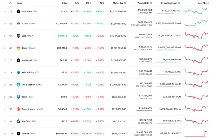 Среди крупнейших игровых токенов Notcoin, согласно CoinMarketCap, занимает 11 строчку рейтинга. В лидеры сектора входят Immutable (IMX) и Floki (FLOKI).