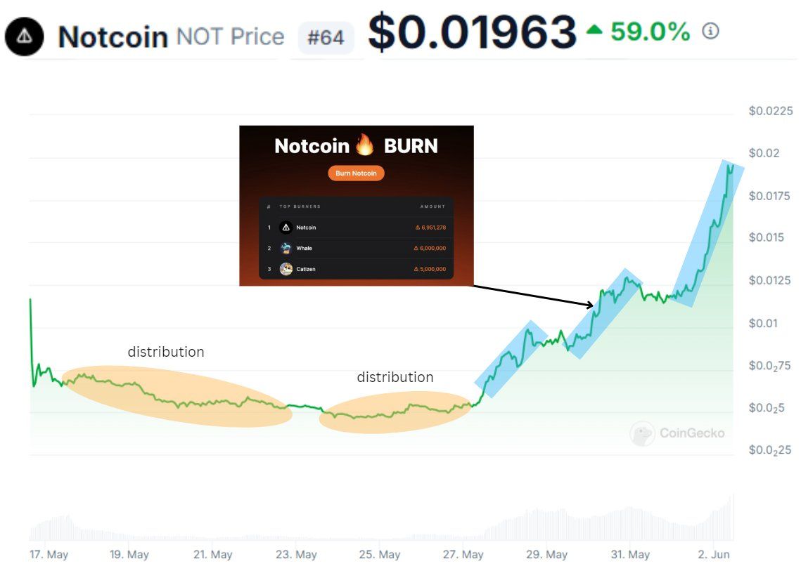 По мнению известного в криптосообществе трейдера Crypto Slam, основными драйверами текущего ценового ралли Notcoin стали: