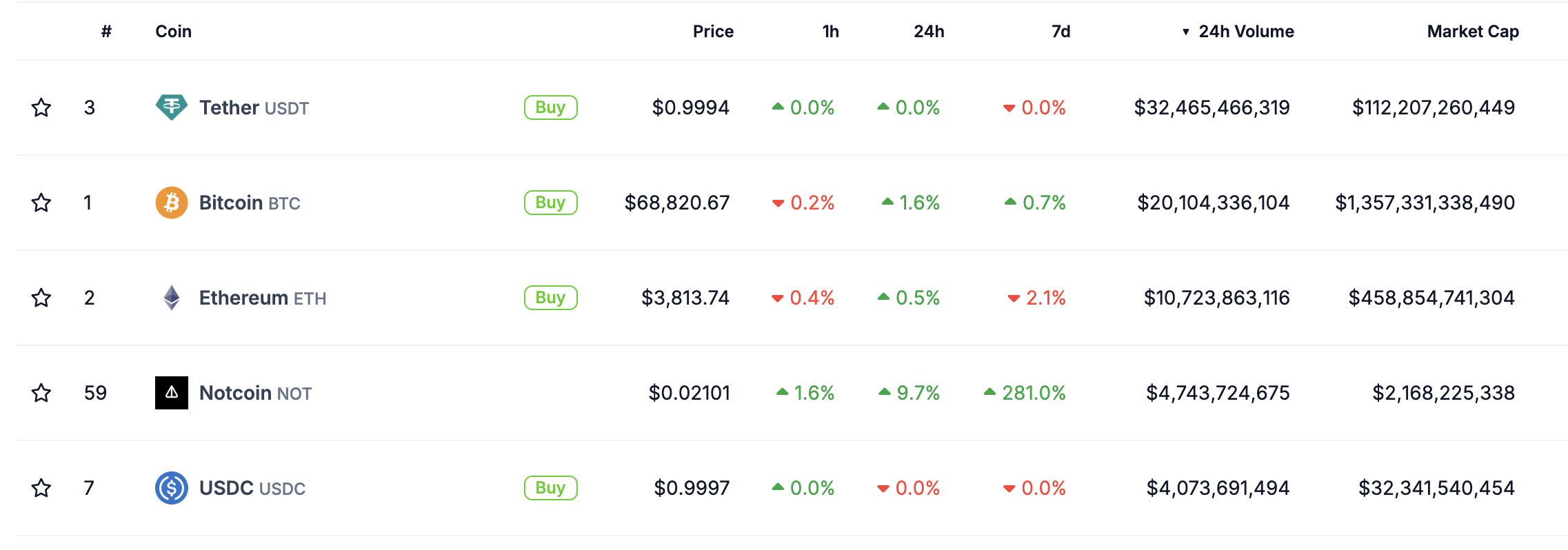 Нашумевший игровой Web3-проект Notcoin разблокировал еще одно достижение. По суточному объему торгов токен NOT вышел на четвертую строчку, уступая лишь биткоину (BTC), Ethereum (ETH) и Tether USD (USDT)