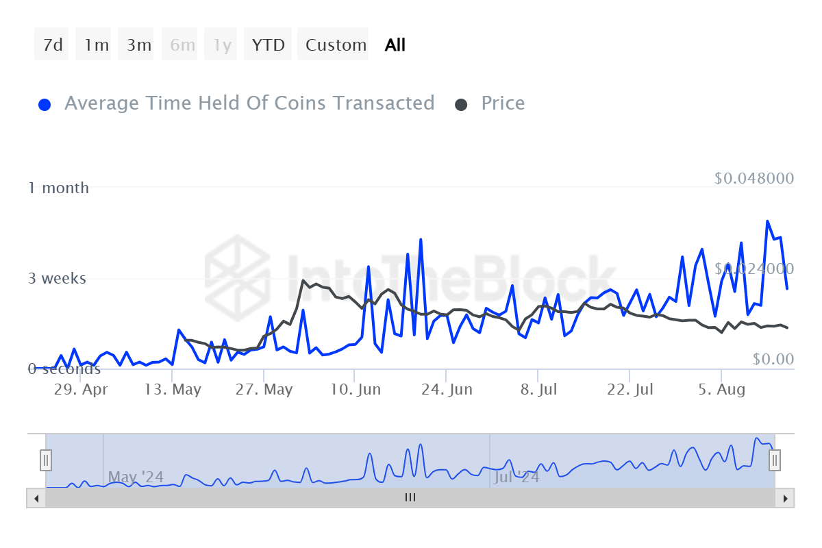 Средний срок хранения недавно купленных NOT увеличился с двух недель до месяца. Это свидетельствует о снижении уверенности инвесторов Notcoin. По мере продажи токенов, которые хранились в течение долгого времени, трейдеры показывают, что не надеются на прибыль.