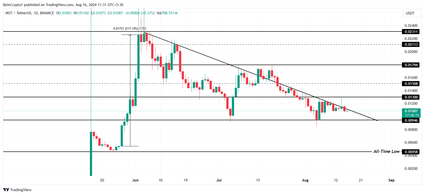 Учитывая вышеупомянутые сигналы, нисходящий тренд может продолжится. В случае, если консолидация сохранится и NOT удержится выше $0,0094, у криптовалюты появится возможность вырваться из нисходящего тренда.