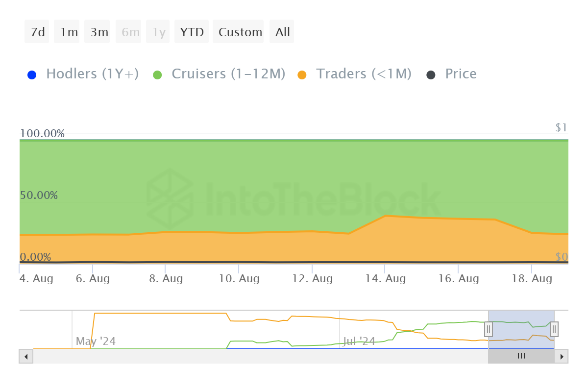 Рост Notcoin забуксовал по нескольким причинам: из-за общей слабости рынка и из-за прироста числа краткосрочных инвесторов. В начале прошлой недели доминирование шортистов по NOT выросло с 24% до 38%.