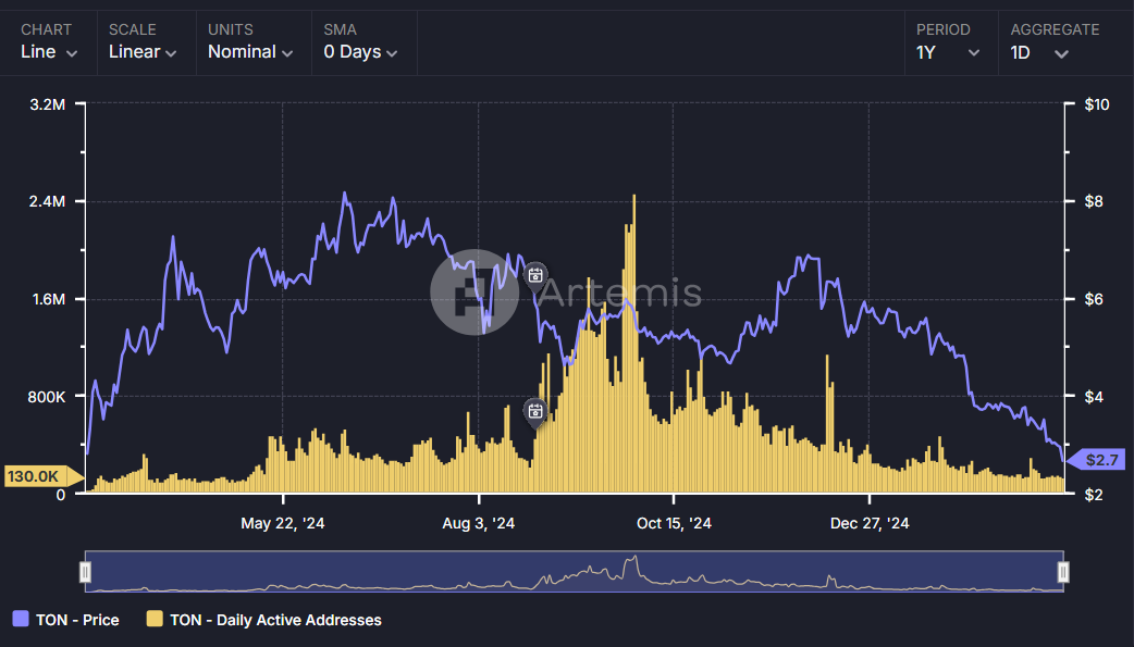 Тем временем данные Artemis показывают, что число активных адресов в сети TON сократилось с 2,4 млн в октябре 2024 года до всего 130 тыс. на момент написания.