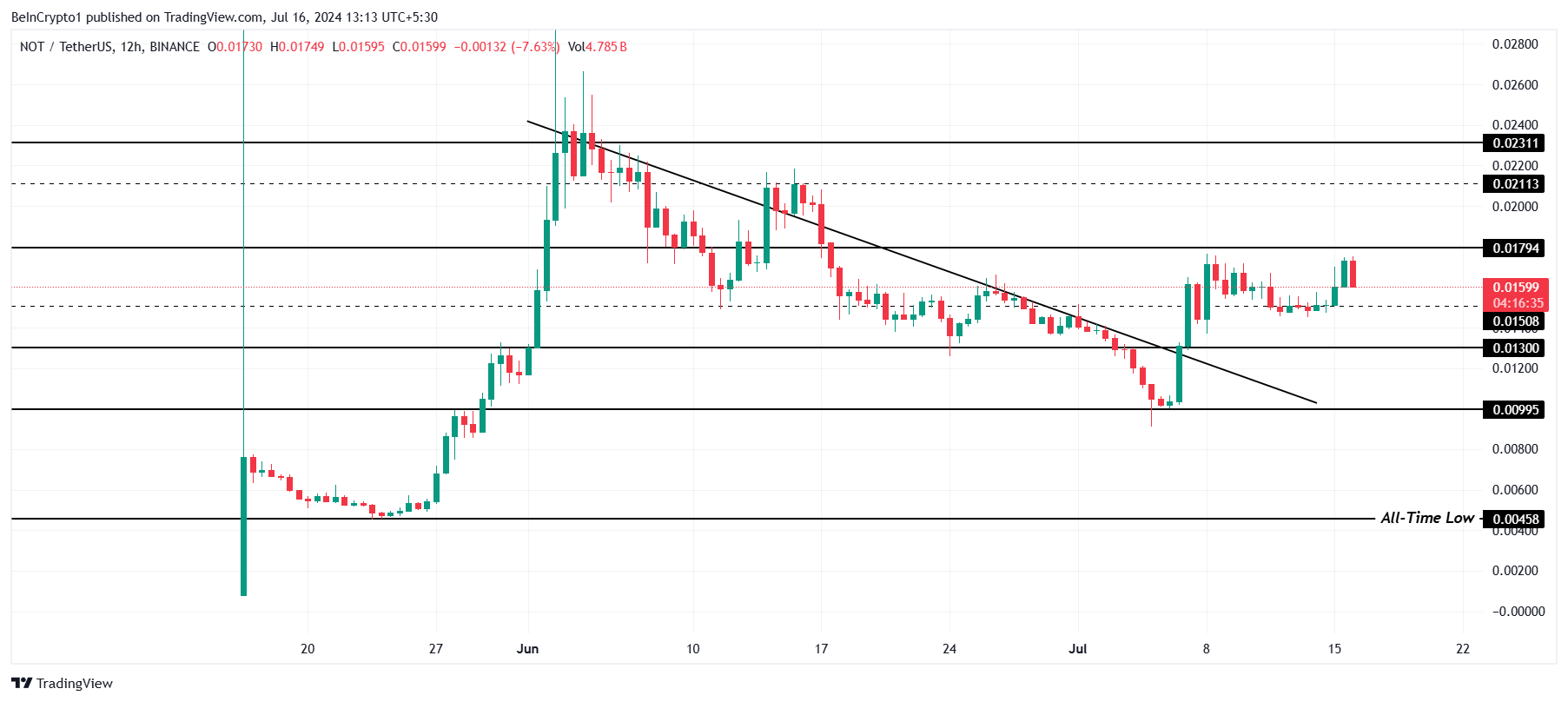 Бычьи настроения инвесторов являются добрым знаком и могут помочь NOT все же прорвать уровень сопротивления. Это позволит токену подняться до $0,02000, увеличив потенциальную прибыль инвесторов.