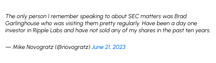 По словам Новограца, единственный, с кем он говорил о судебном преследовании Ripple, был глава самой финтех-компании Брэд Гарлингхаус. Заявления Новограца стали ответом на предположения одного из ключевых участников Ripple-сообщества под ником @Leerzeit об инсайдерской связи криптоинвестора с Хинманом.