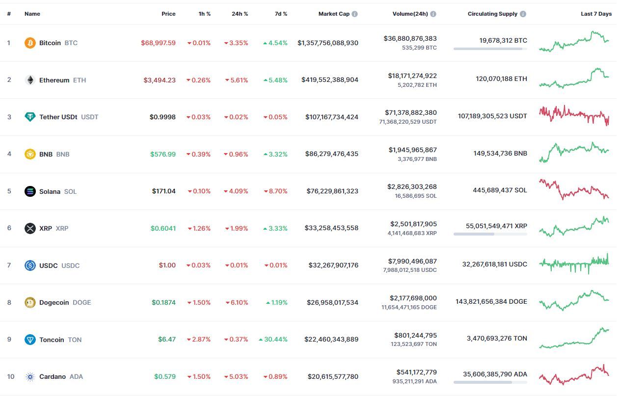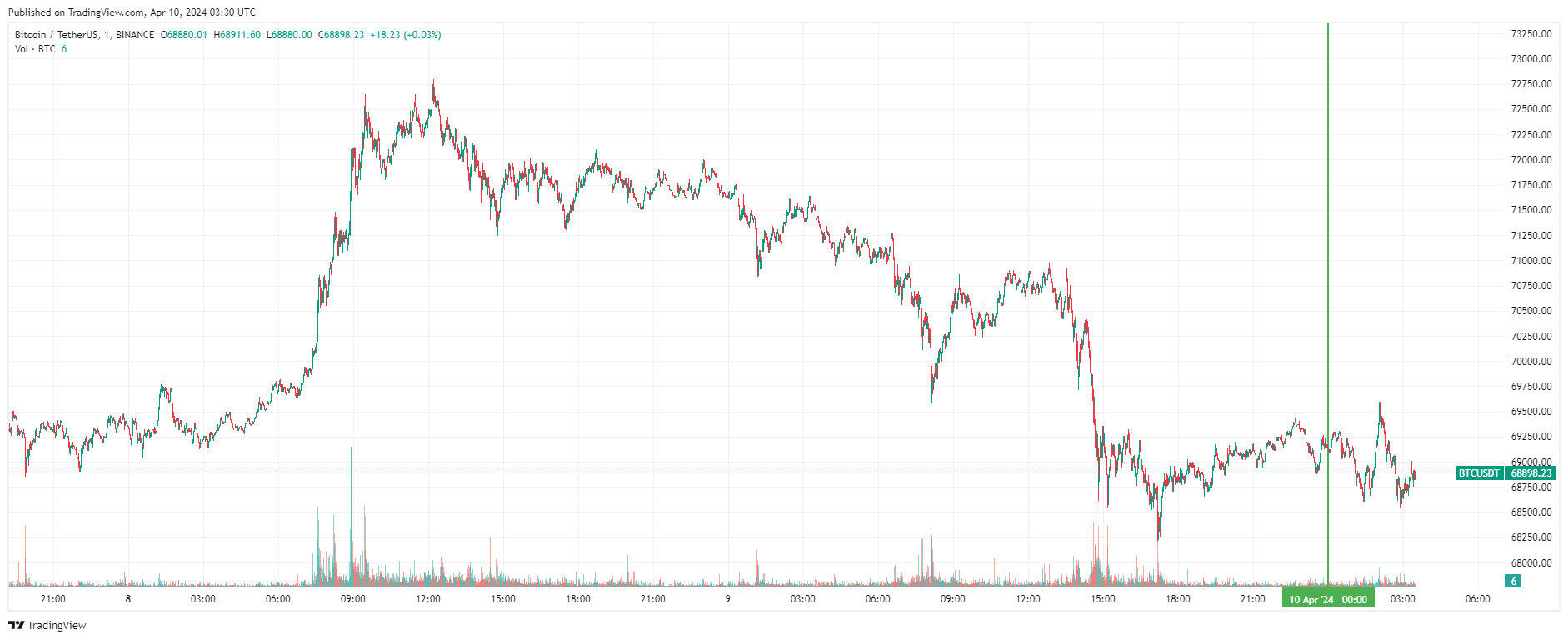 Биткоин (BTC), по данным ресурса TradingView, начал среду с бокового движения. По состоянию на 06:37 (МСК), криптовалюта торгуется по $68 898 (1 токен в рублях — ₽6,413,356.). Минимум биткоина за 24 часа — $68 212, максимум — $71 331.