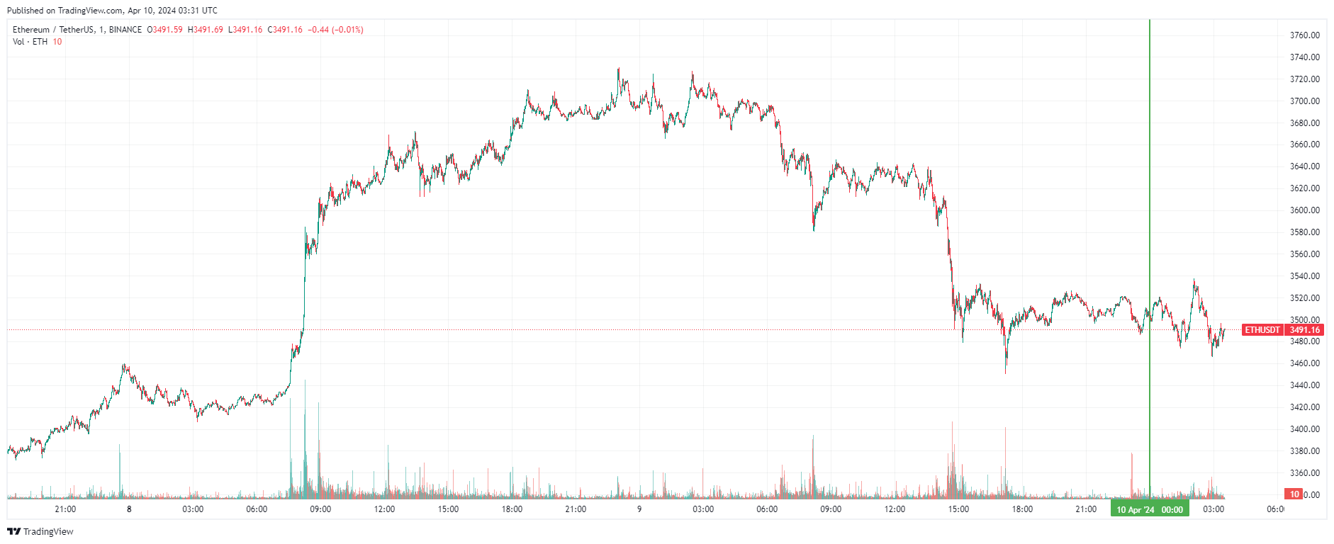 Ethereum также начал день с бокового движения. По состоянию на момент написания статьи, монета торгуется по $3 491 (1 токен в рублях — ₽325,062).