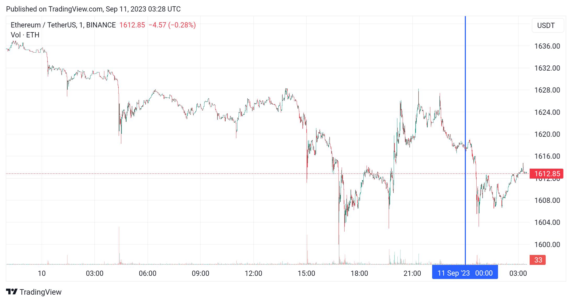 Вторая по капитализации криптовалюта Ethereum также начала день с падения. По состоянию на момент написания обзора, монета торгуется по $1612 (1 токен в рублях — ₽157,633).
