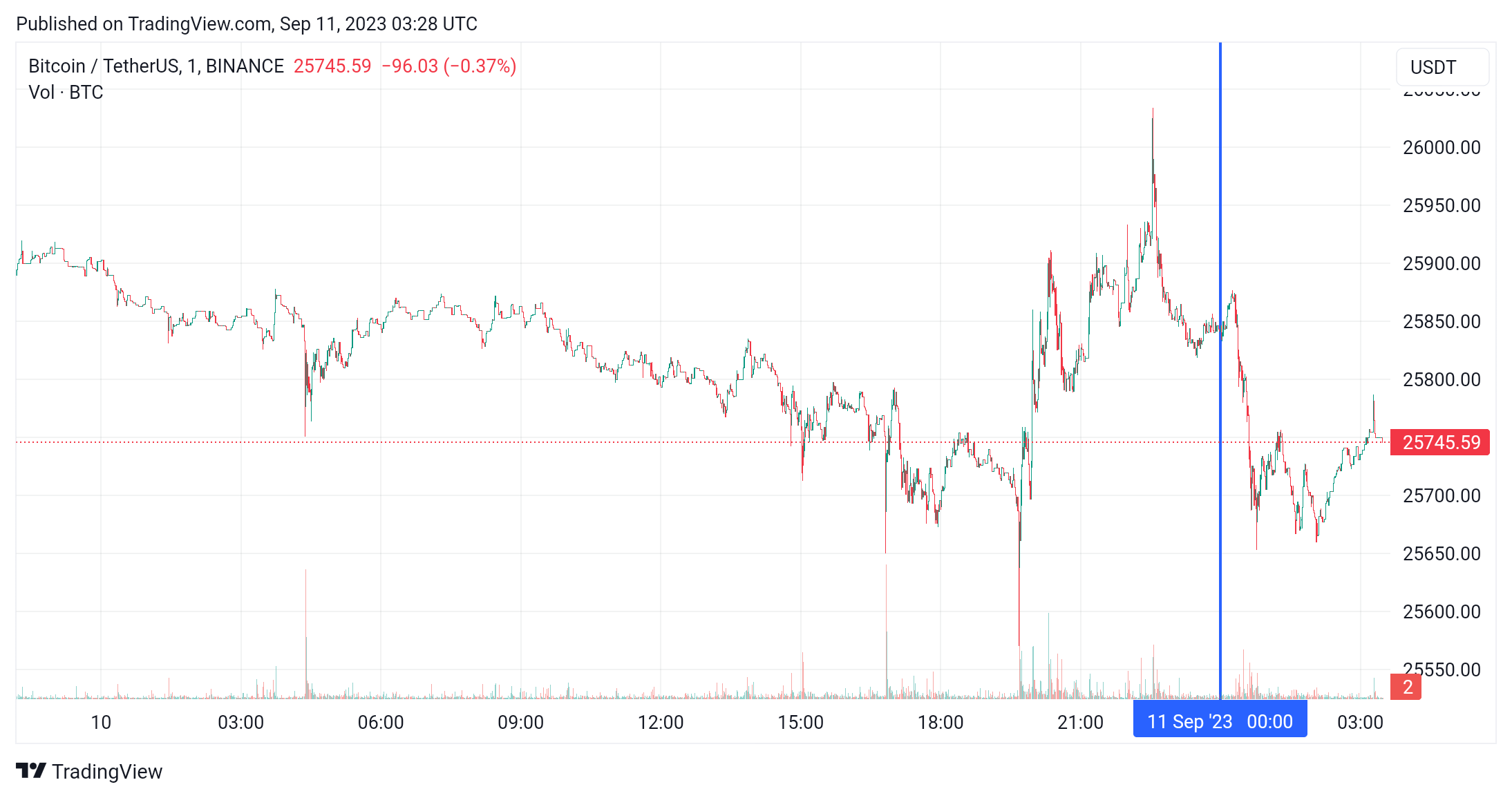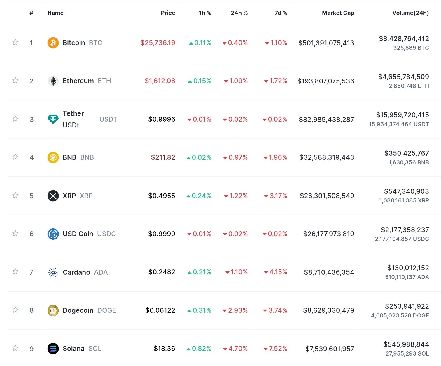 Биткоин (BTC), по данным ресурса CoinMarketCap, начал понедельник с падения. По состоянию на 06:35 (МСК), криптовалюта торгуется по $25 745 (1 токен в рублях — ₽2,515,846). Минимум биткоина за 24 часа — $25 640, максимум — $25 978.