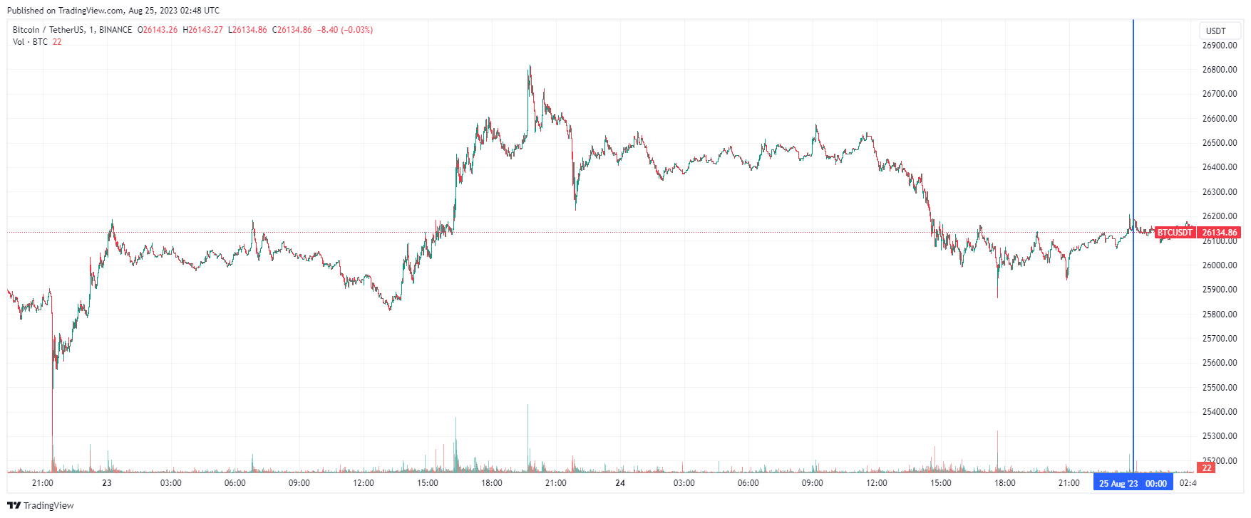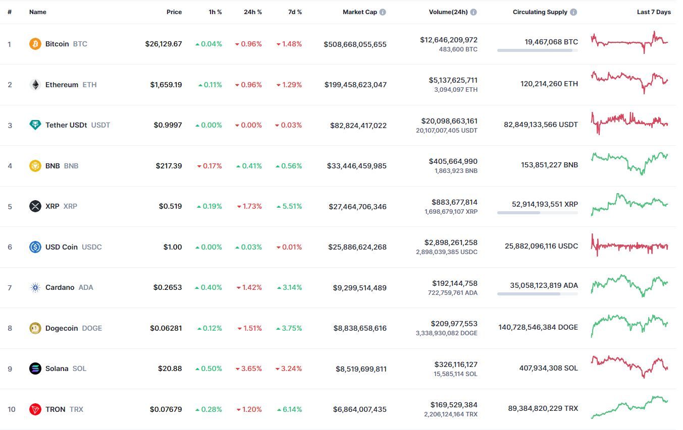 Биткоин (BTC), по данным ресурса CoinMarketCap, начал пятницу с бокового движения. По состоянию на 05:50 (МСК), криптовалюта торгуется по $26 134 (1 токен в рублях — ₽2,467,985). Минимум биткоина за 24 часа — $25 914, максимум — $26 554.